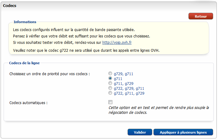 Kies de codec voorkeur die jij wenst en bevestig met "Valider" (of "Appliquer à plusieurs lignes" indien je deze keuze voor meerdere nummers wil doorvoeren).