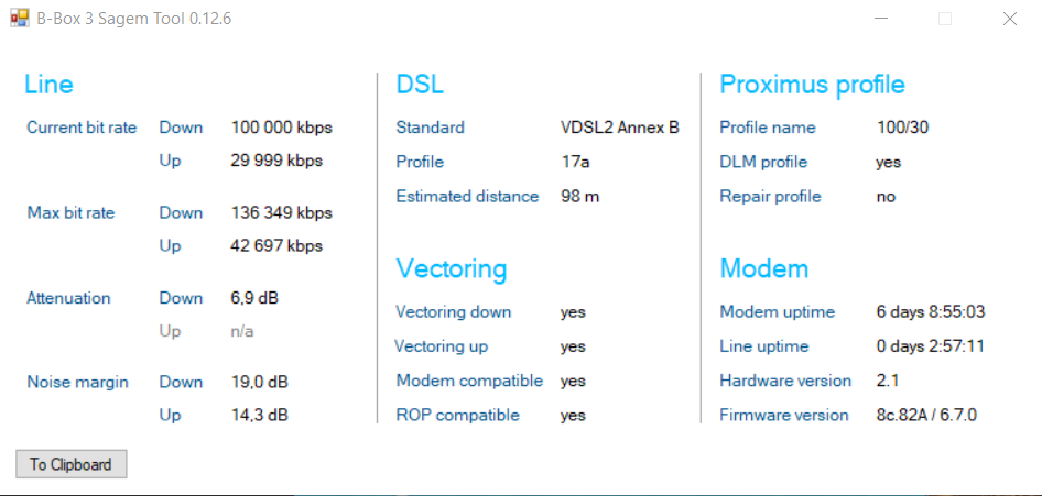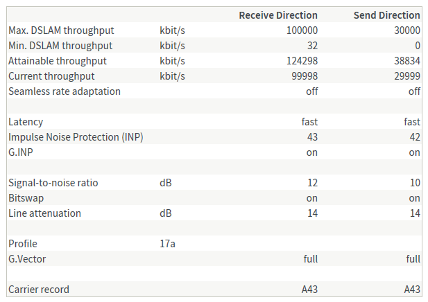 Ik heb nu al bijna een week een stabiel 100/30 profiel met 12/9 dB SNR. Attainable throughput 124546 DL (iets lager dan voor de resync) en 37343 UL (iets hoger dan voor de resync).