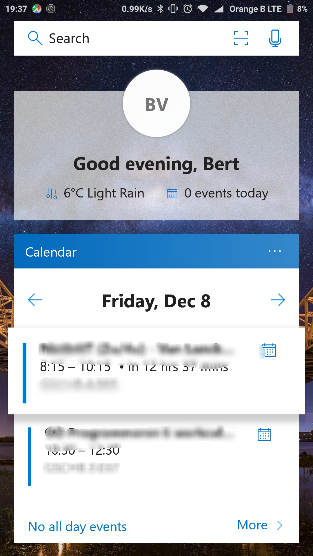 @r2504 Ooit de MS Launcher op Android geprobeerd ? Is wel sterk geblurd maar hieronder overzichtje. Swipe je naar links dan kan je die pagina vullen met widgets. Standaard staat je kalender er, je laatste notifications, je veelgebruikte contacten en je inbox en van Outlook kan je er ook kwijt. Per account.