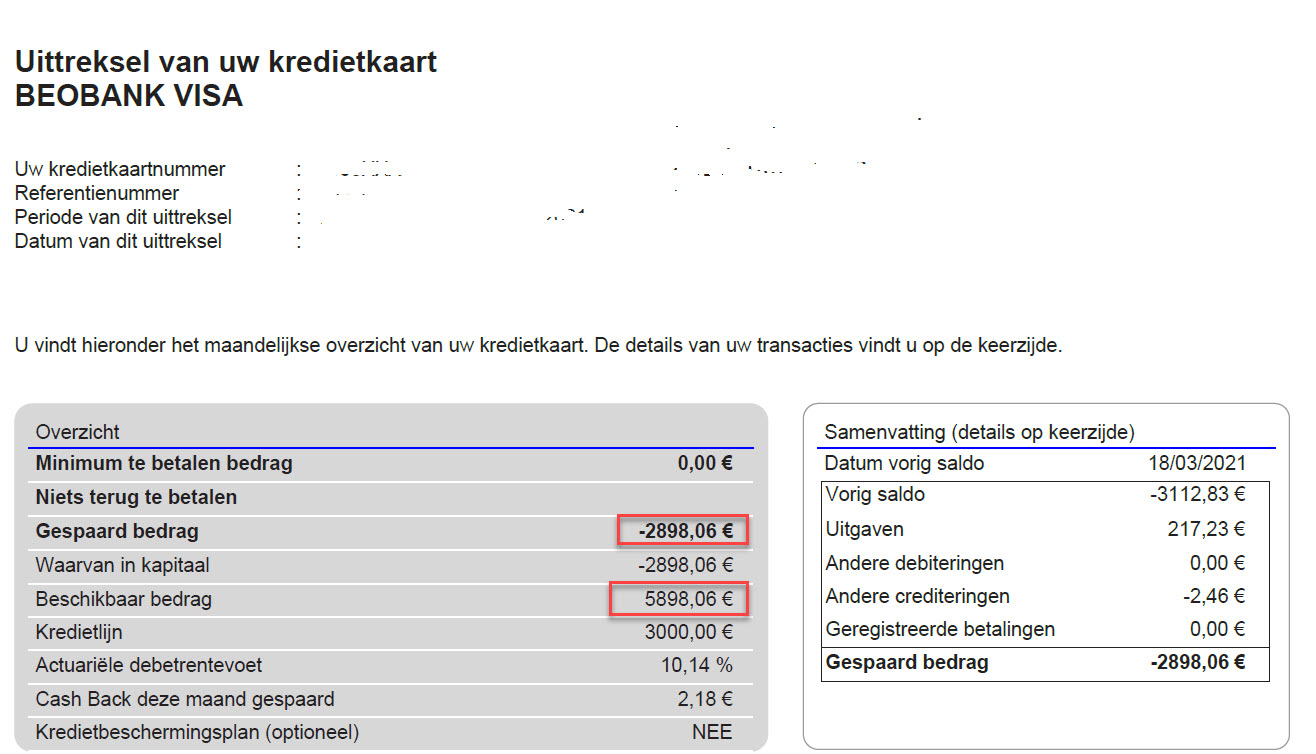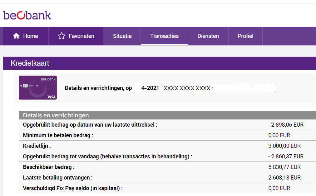 Ik heb kredietlijn van 3.000 €. Ik heb géén communicatie gekregen dat het in orde was. Maar zag plots 5830,77 € beschikbaar staan. Denk al 18/3 transactiestaat zichtbaar. Ik heb nog eens mail gestuurd. géén reactie. Dan 2 weken terug gebeld. En chargeback dienst was niet bereikbaar dat moment, en eerstelijns zou terugbellen. Het stond 'on hold dat gecrediteerd bedrag'. Paar dagen later belde ze terug om te zeggen dat het OK was. Die persoon was 'vergeten' brief te sturen.