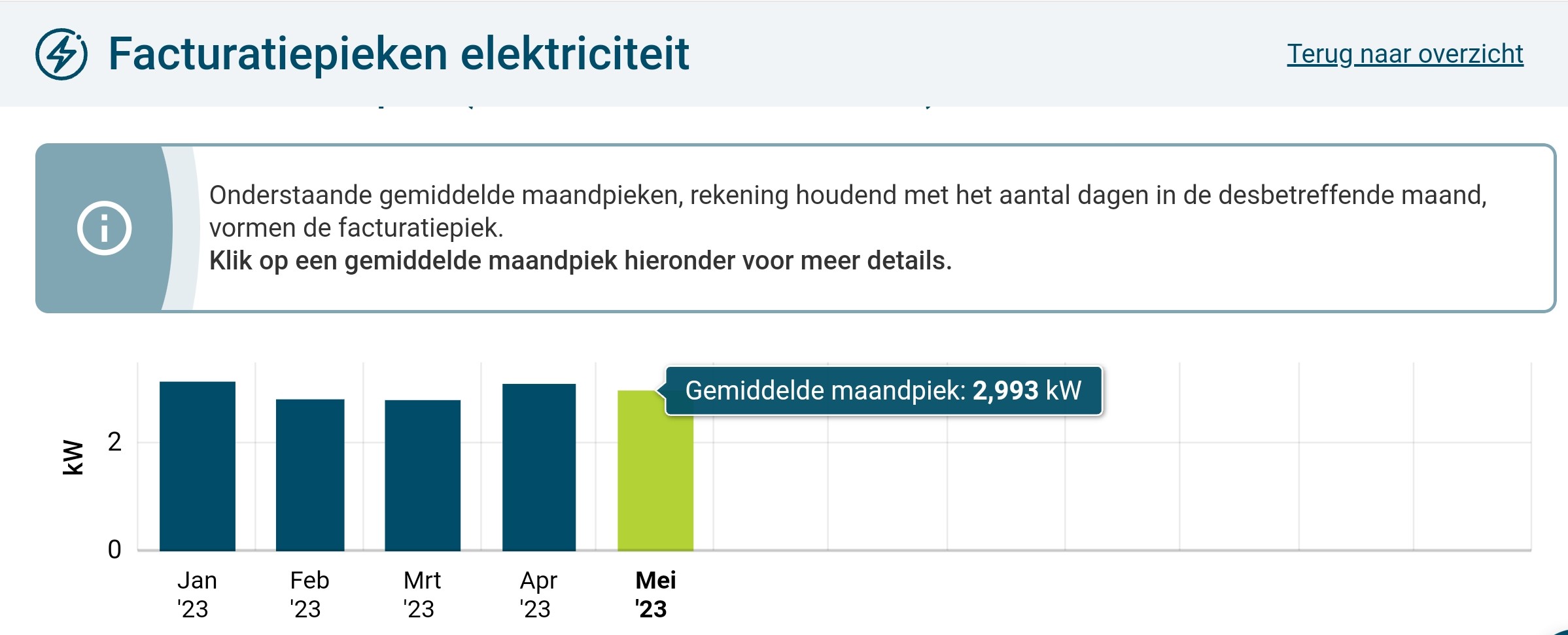 Het te betalen verschil in jouw voorbeeld is dus slechts de kostprijs van 1 kW. Op jaarbasis. Het capaciteitstarief wordt niet afgerekend op maandbasis (of je zou eenmalig in 2023 al in februari een afrekening moeten krijgen) maar op het gemiddelde van de laatste maandpieken. De gemiddelde maandpiek die nu van toepassing is (moest er nu een jaarafrekening gemaakt worden) vind je telkens in de laatste maandkolom van de facturatiepieken (dus niet de daadwerkelijk gemeten technische pieken) op Mijn Fluvius. Dat getal vermenigvuldig je dan met de waarde in € voor je eigen netgebied (incl. BTW).
