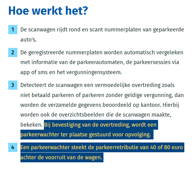 - bij vermoeden overtreding wordt iemand nagestuurd die een controle doet, en dan pas indien geen parkeerrecht een bon onder de ruitsenwisser steekt