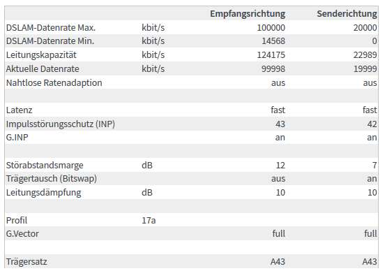 Even inpikken op het "Annex A"-verhaal. Zat op "Annex B" met een 100/20-profiel en een Up-SNR van 7. Toch syncte mijn FB7490 "maar" 19.5Mbps in de upload... Daarom eens naar Annex A geswitcht.... Marginale verschillen in waarden, maar wel de full 20 Mbps nu...