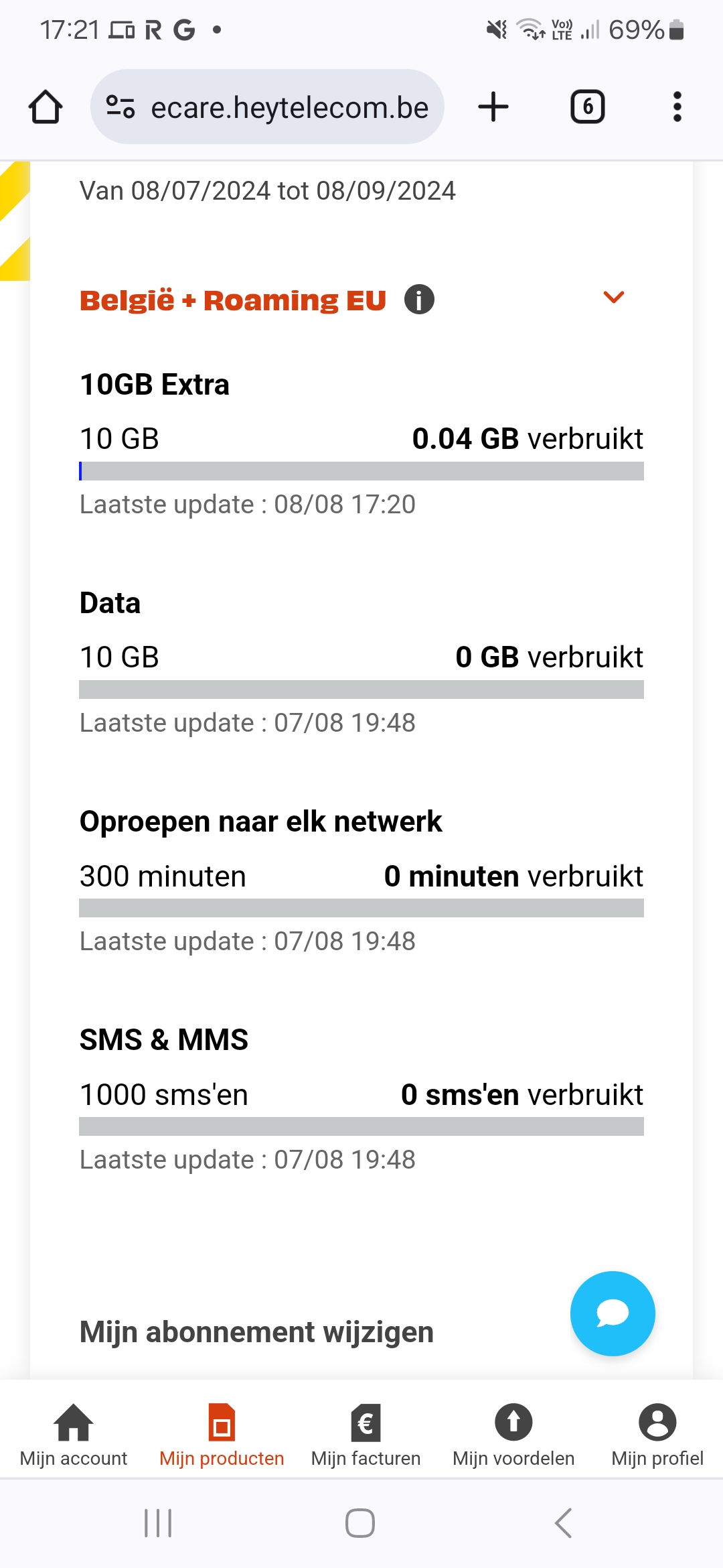 Belgie + EU: 0,25 GB van 10 GB verbruikt