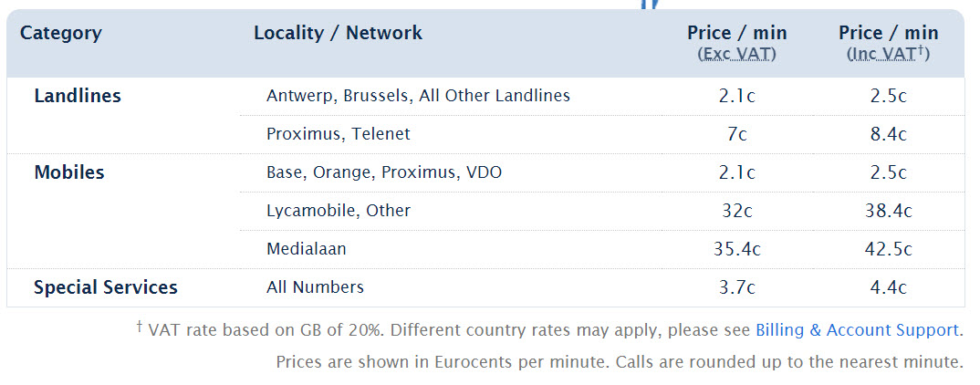 Ik heb nog geen problemen ondervonden met op opbellen van Belgische vaste nummers (gebruik maken met mijn vaste lijn caller-id).