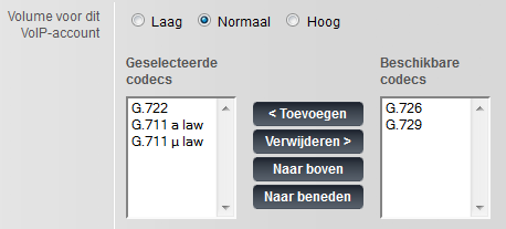 Ook de volgorde in de linker kolom kan ik eenvoudig aanpassen (naar boven of naar beneden). Bij een recente Fritz!box dient men handmatig configuratiefiles (tekst files) aan te passen om de selectie (en hun volgorde) van de codecs te bepalen.