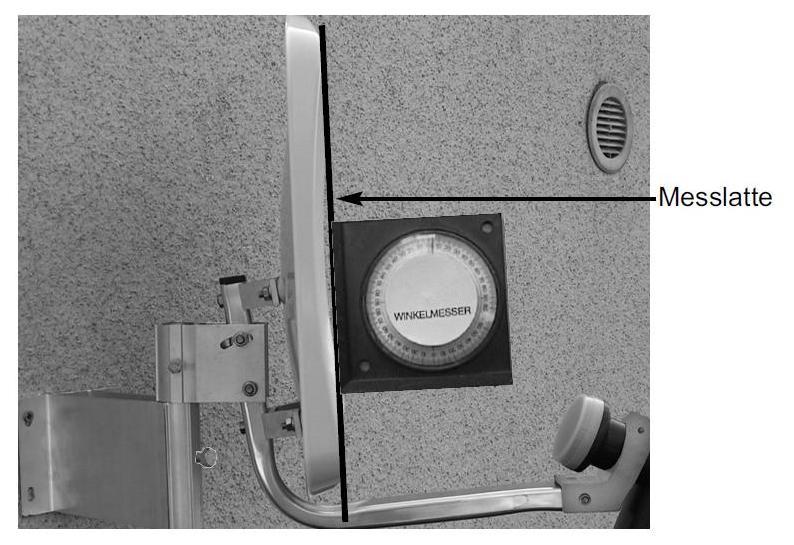 Het probleem is dat ze bij de Technisat slechts 6,5° schuin staan naar het oosten. Je moet de buis waarop de schotel gemonteerd is dus nog 3,83° naar rechts kantelen als je voor de schotel staat.
