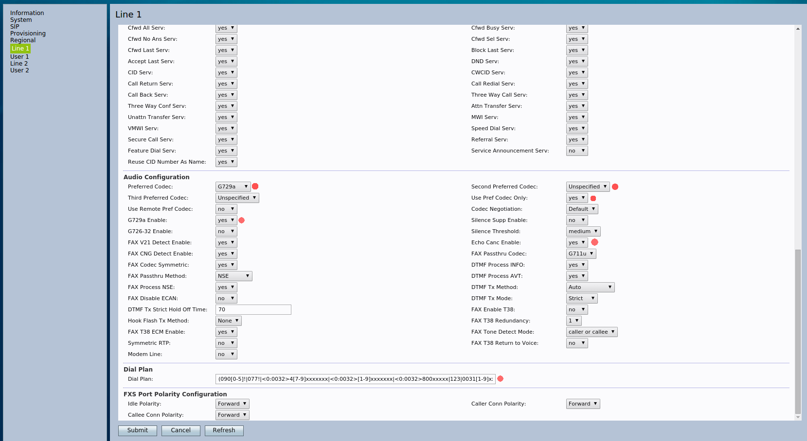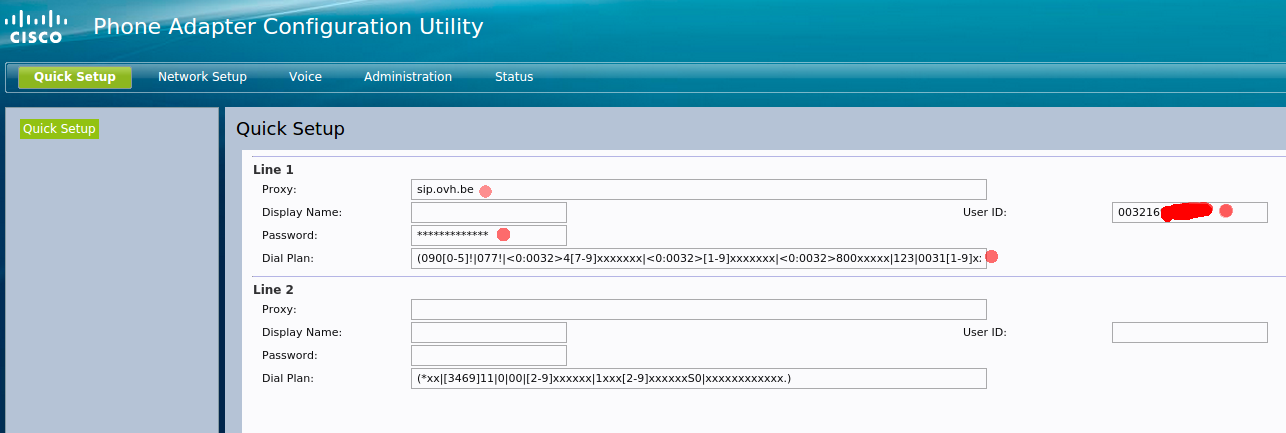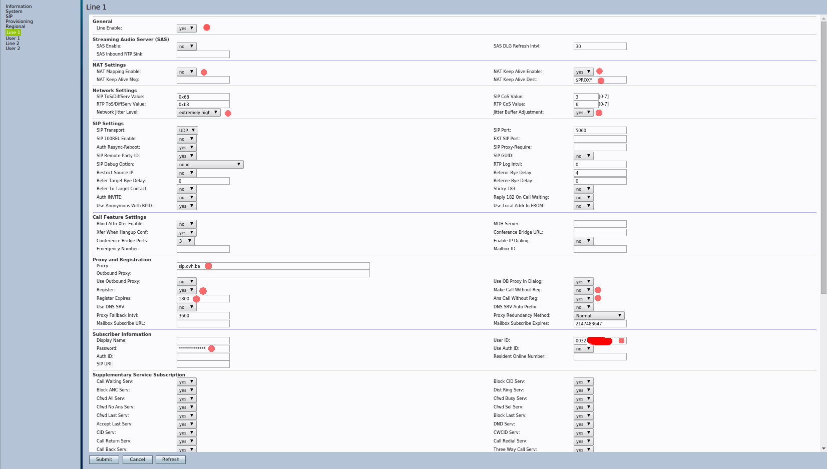 Enkel de codec g729a wil je misschien aanpassen naar g711a of g711u. Ik weet niet meer juist dewelke, maar slechts 1 van de 2 zal werken. kwaliteit van g711 is beter, g729a is beter bestand tegen netwerkproblemen.