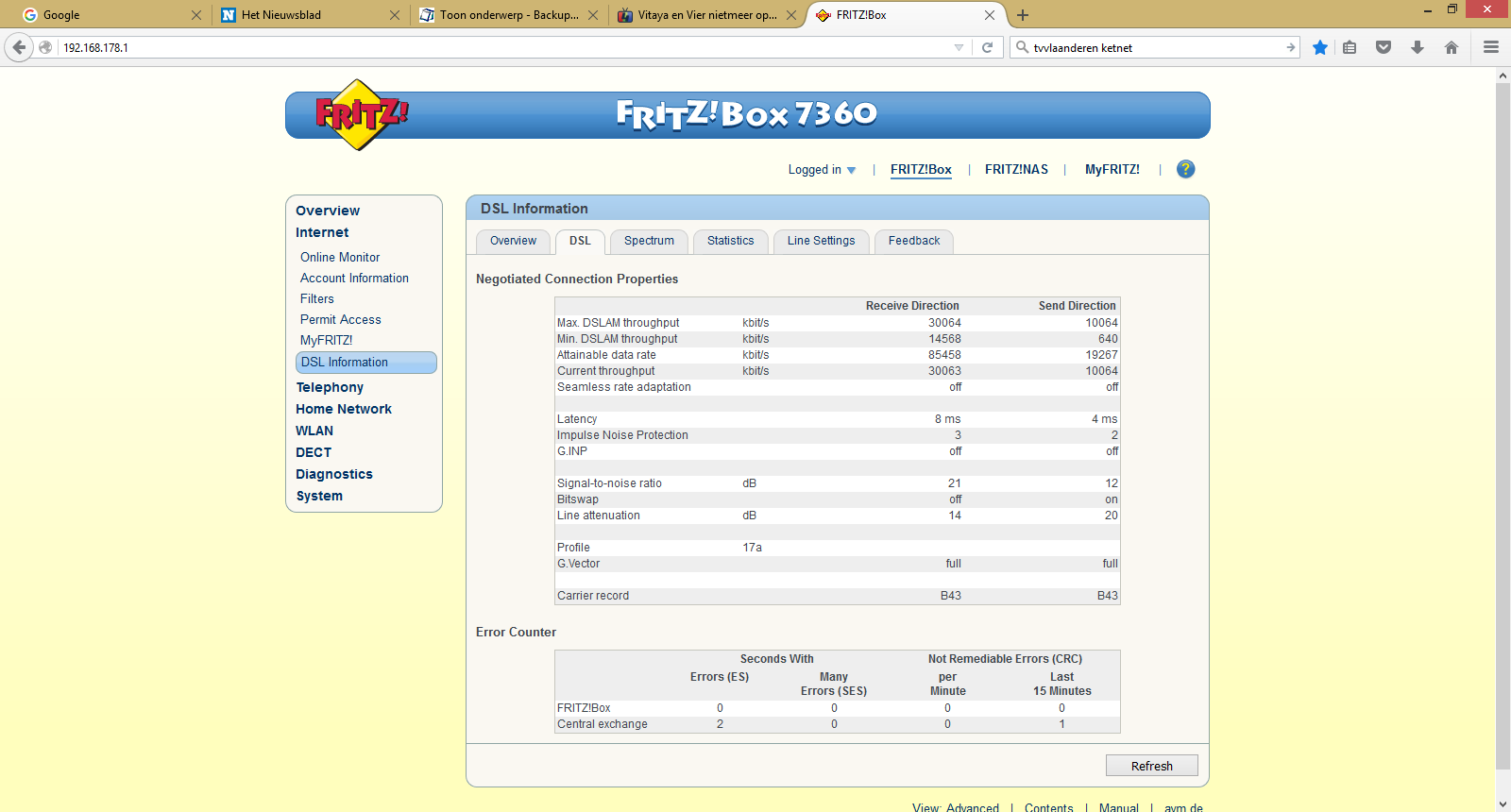 Ik bedoel de Tab "DSL" (met alle waarden voor downstream en upstream).