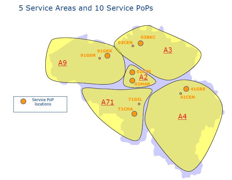 Proximus heeft in België 5 "service area's", en in ieder service area 2 POP's (point of presense")