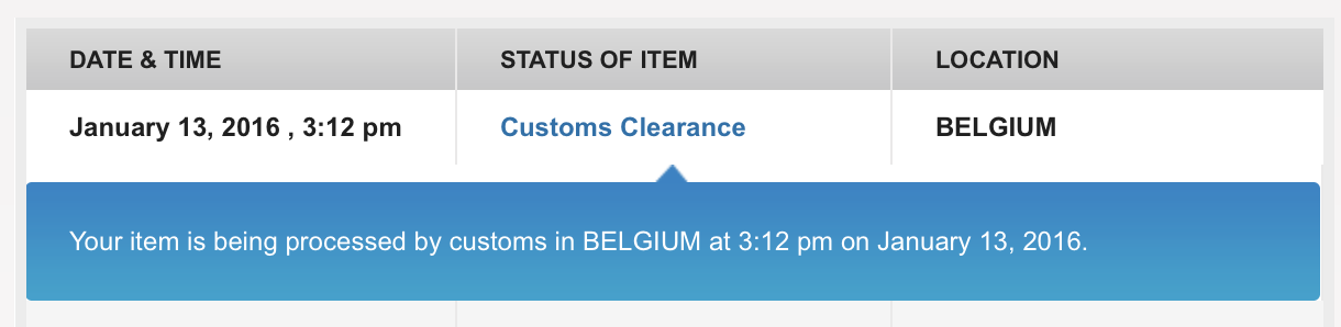 Als je nog moet betalen, moeten ze het nog checken, factuur bekijken, belasting bereken, aan bpost doorgeven, bpost stuurt je een brief en dan moet je nog eerst betalen. Eens de betaling binnen is, geven ze het vrij.