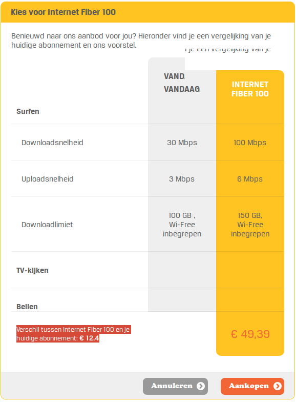 Verschil tussen Internet Fiber 100 en je huidige abonnement: € 7,4. Ik kies voor straffer internet
