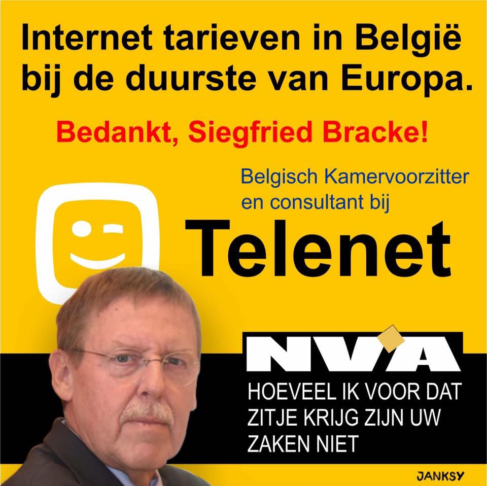 De reactie van telenet spreekt boekdelen: de consultants zoals brack worden geraadpleegd wanneer nodig. Dat leest als, Wanneer ons bedrijf politieke macht nodig heeft bellen ze bracke op, geven hem 2000 euro, en bracke forceert een nieuwe wet of regeling ten gunste van telenet, zo simpel zit dat in elkaar, bracke heeft immers geen kennis van zake...een consultant ? Dit is actief lobbywerk zoals in de usa.