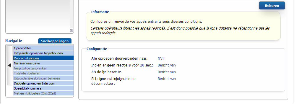 Niet echt een idee wat er misgaat, maar je kan eens checken bij Gestion des appels ==> Renvoi d'appel of alle oproepen op de gewenste manier naar de répondeur/antwoordapparaat worden gestuurd.