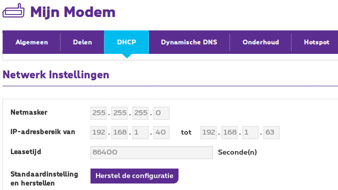 Echter ik stuit op volgend probleem als ik de pool wijzig van x.x.x.1 tot x.x.x.63 naar x.x.x.40 tot x.x.x.63 moet ik opnieuw de statische gaan toewijzen aan de hand van hun mac adres, gelukkig heb ik daar een lijstje van liggen.