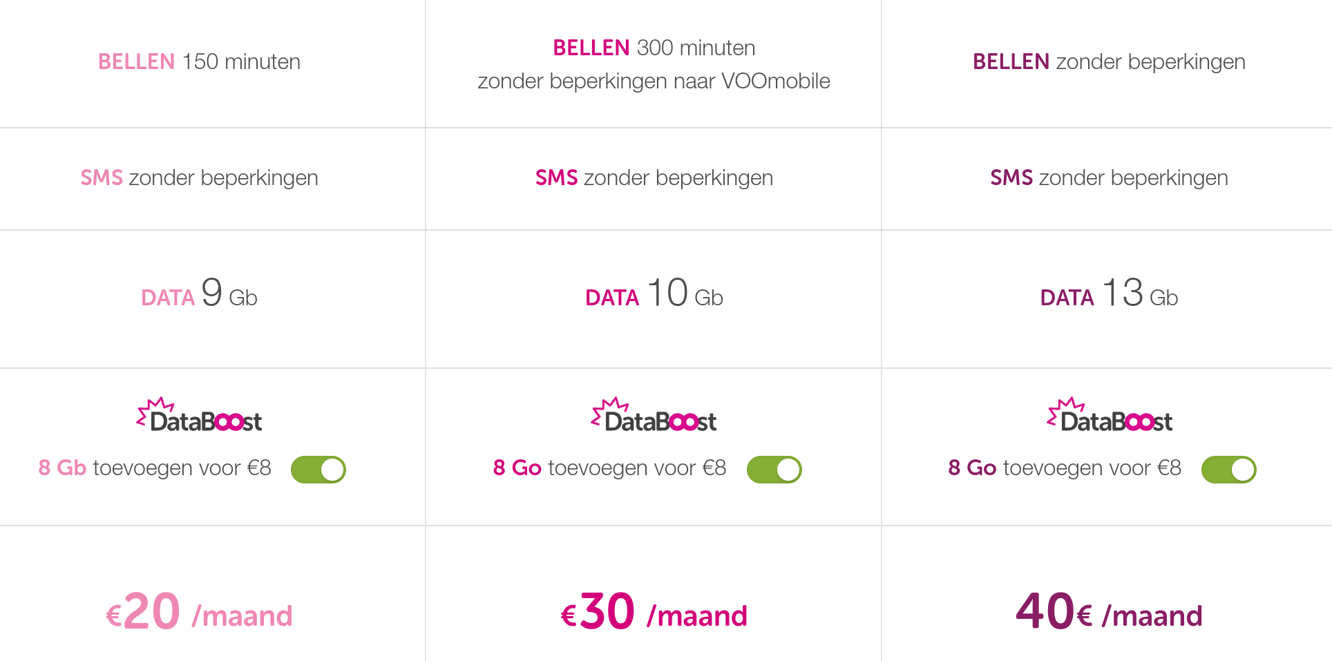 Voo schreef:8 GB voor € 8 per maand. Aanbieding enkel geldig voor de eerste 10.000 klanten. De ongebruikte MB worden niet overgedragen naar de volgende maand. De mobiele volume internet inbegrepen in de aanbieding is geldig in België, voor een vergoeding van 0,0605 € / MB in de EU.