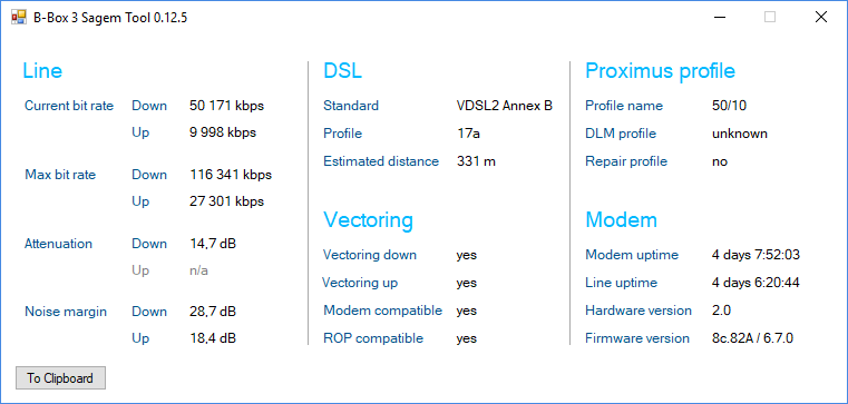 Ik begin echter te twijfelen. Zou ik dan toch in zone 2 terecht gekomen zijn? 50/6 profiel met vectoring en zonder DLM dan. Ik volg je tabel op: https://userbase.be/forum/viewtopic.php?t=46577. De afstand is ok, rond de 300 meter (dus < 400 meter voor zone 1) maar de verzwakking kan ik niet uitlezen in de BBOX3 tool. Ik zal anders vanavond nog een nieuwe test doen.