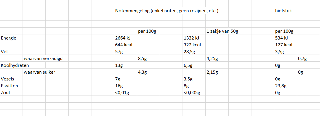 Ik krijg ook beduidend meer suiker binnen bij de noten (geen bij het biefstuk, 2,5g bij de noten).