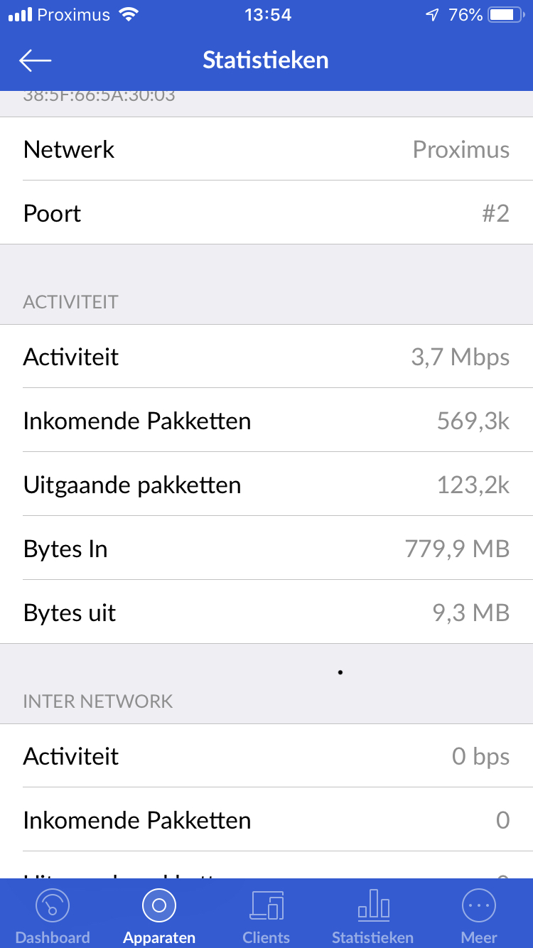 De enige uitzondering is de TV decoder, die zit rechtstreeks gepatched op de BBox en maakt dus geen deel uit van mijn netwerk. Ik had die toch graag achter mijn Unifi Security Gateway gehad al was het maar om in de Unifi Controller te kunnen zien met hoeveel bandbreedte deze TV decoder (V6) aan de haal gaat. De technieker zei dat het best was om de TV decoder rechtstreeks op de BBox te laten maar toch wil ik hier de vraag eens plaatsen om te weten of deze toch niet op mijn eigen netwerk zou kunnen komen? De argumenten van de technieker waren dat je IGMP snooping moet hebben op staan en dat ook je switchen hier mee compatibel moet zijn.