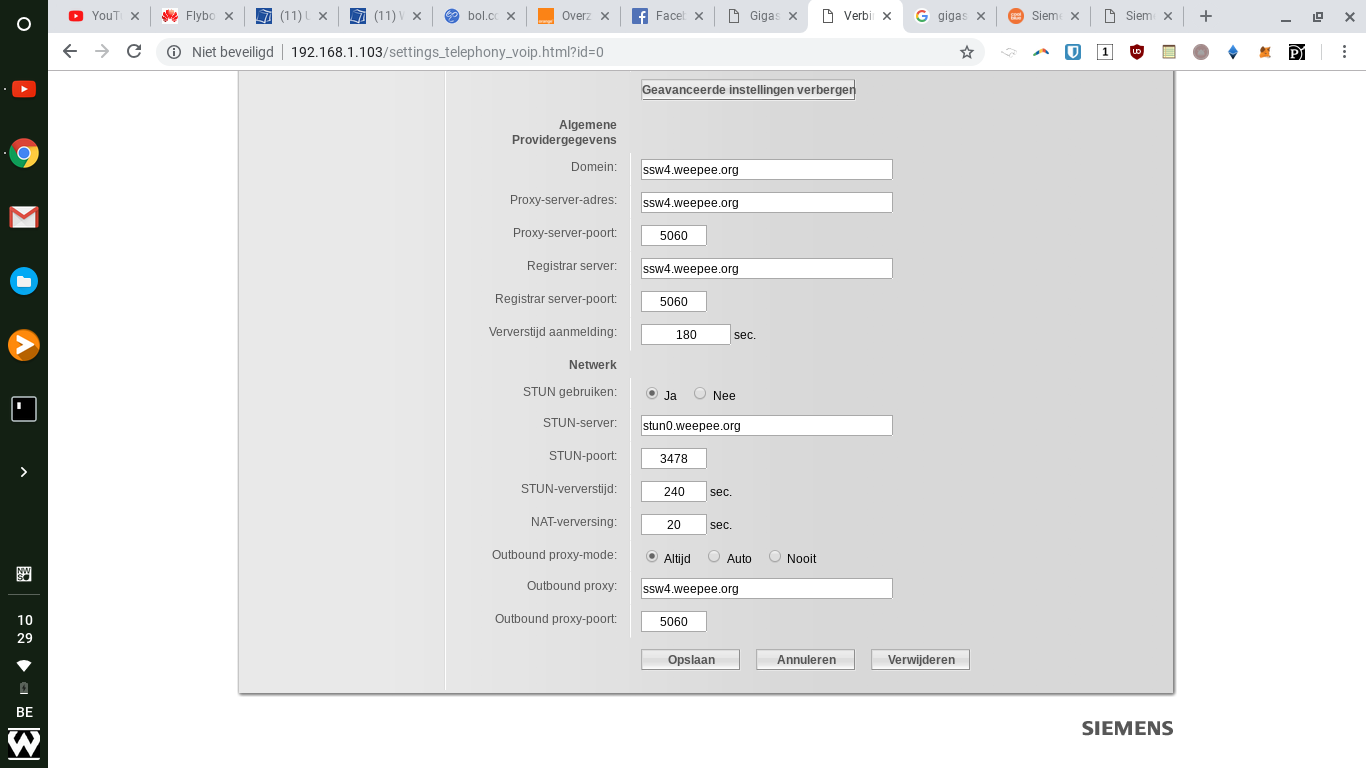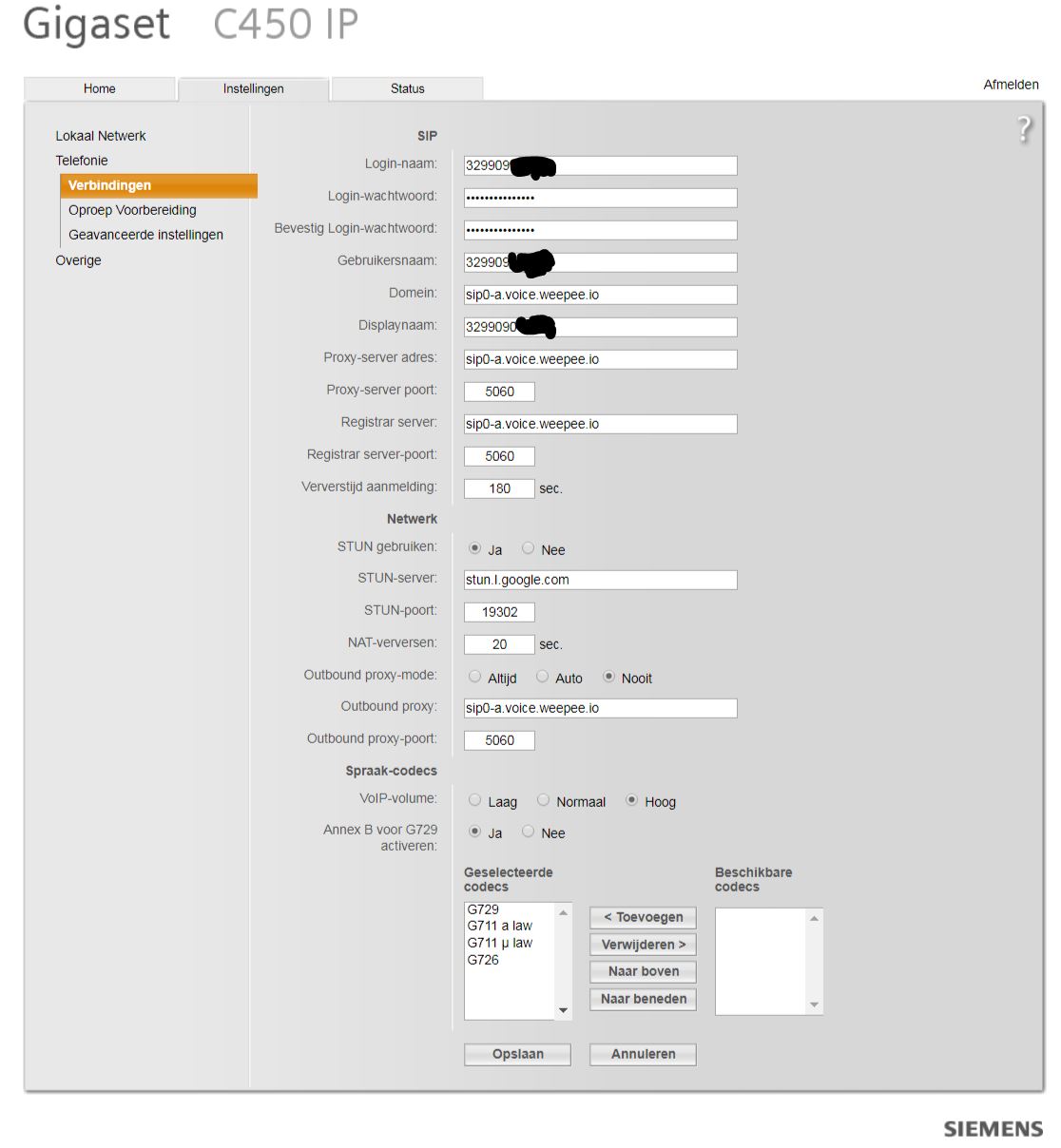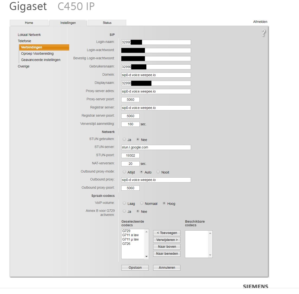 - Met de adressen "sip0-d.voice.weepee.io" en "ssw4.weepee.org" lukt het aanmelden,