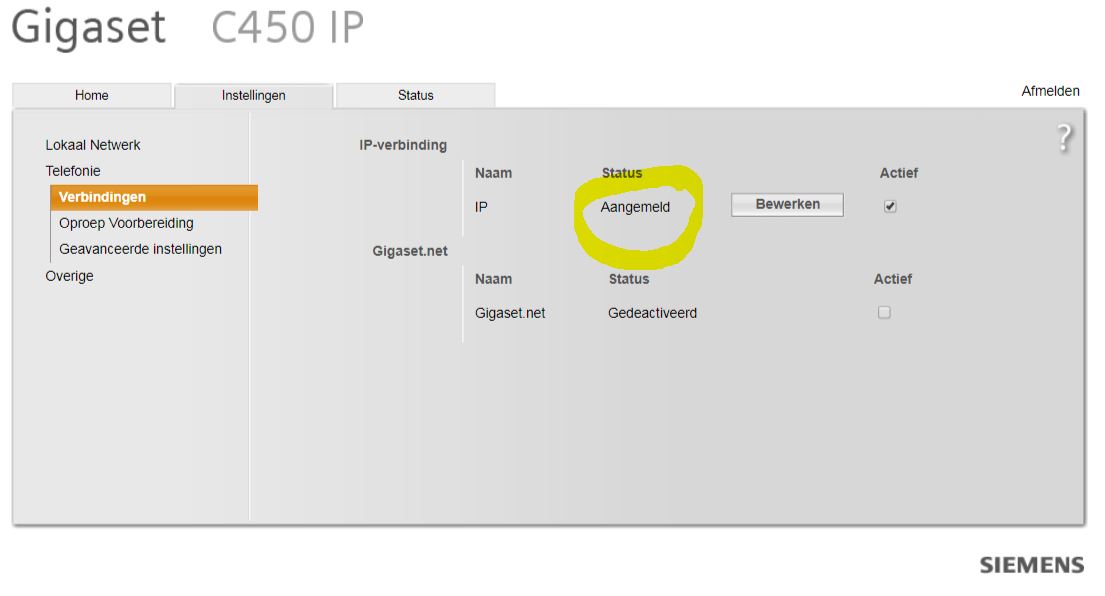 De Gigaset is "aangemeld" en is "gevalideerd" in de WeePee-klantentool.