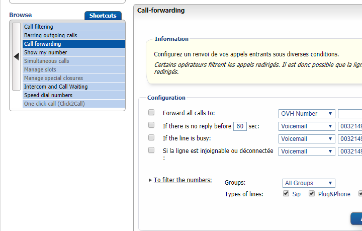 Volgens de OVH support moet de voicemail doorgestuurd worden....