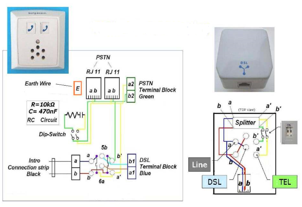 - zoals duidelijk te zien op de tekening komt het binnenkomend signaal (via a+b) rechtsreeks terecht op de RJ11 (naar de modem) en op de pinnen (5b en 5a). Het VDSL2 signaal wordt dus niet "gefilterd"!