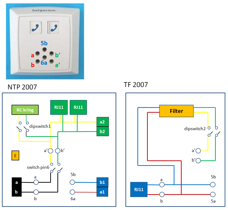 - Bij de VoIP adapter is er geen filter en komt er niets terug op a' en b'. Idem bij VoIP installaties waar de dipswitches geopend staan. Hierdoor kan je dus het analoog telefoniesignaal vanuit de modem naar de NTP koppelen (RJ11), en vandaar via het groene blokje naar je telefonie binnenbekabeling.