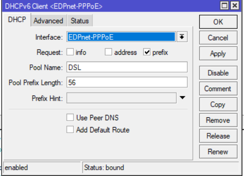 Nu is het zo dat ik op mijn Mikrotik (RB3011) router (waarop de PPPoE sessie wordt opgebouwd) geen IPv6 adres krijg (DHCP).