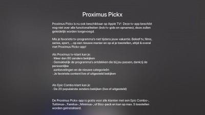 En ik weet niet of dit hier al staat, maar ondertussen kan je de app downloaden voor Apple TV.bollewolle schreef:Niet zeker of het hier gepast is of in een nieuwe post (heb er nog niets rond zien passeren hier), maar in de press release rond hun nieuwe strategie staat ook deze passage:Als het een app is zou het wel interessant kunnen zijn voor de cord-cutters als ze deze op termijn ook voor de rest zouden open stellen.Tegen het einde van de eerste helft van het jaar, kunnen Proximus klanten genieten van Apple TV 4K als voornaamste decoder in hun 'Epic combo full’ aanbod. Daarnaast zullen klanten, die ingaan op het ‘Epic Combo Full’ aanbod met Apple TV 4K, ook kunnen genieten van 1 jaar gratis Apple TV+.