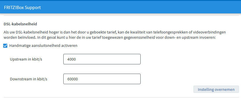 Als je bijvoorbeeld Internet Start hebt (50/4), maar je hebt een sync van 100/35, dan houdt de Fritz!Box geen rekening met jouw effectieve snelheid, maar met jouw DSL sync.