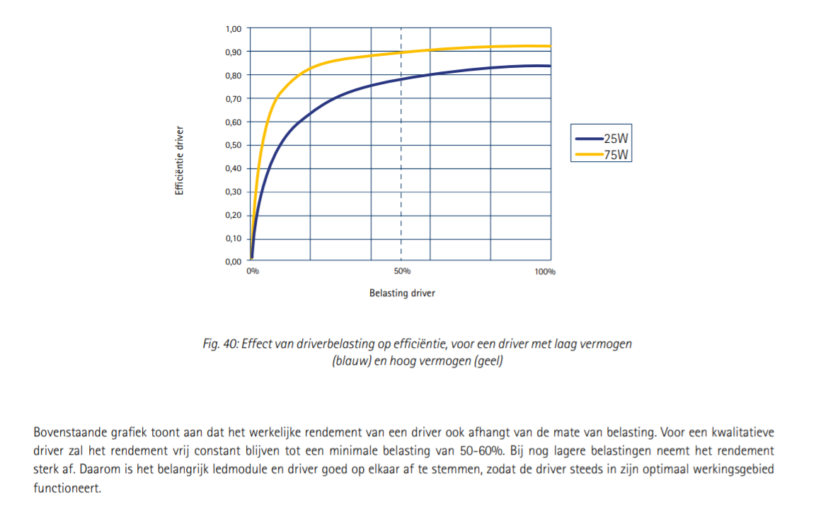 Hierdoor zal een 80W driver aan 50% belasting een beter rendement hebben dan een 40W driver aan 100% belasting.