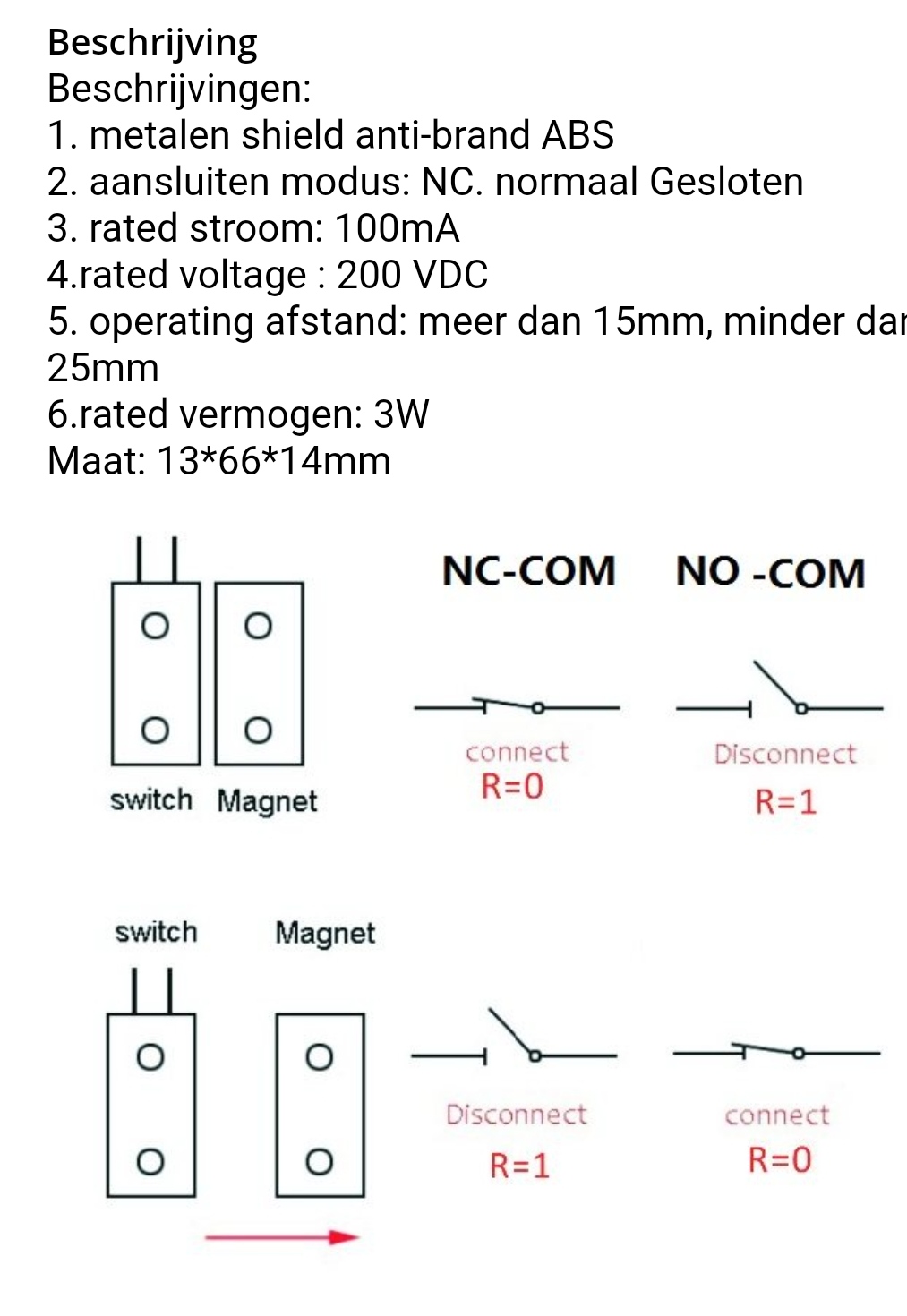 Het contact daarvan is geopend wanneer de poort dicht is en het magneetcontact sluit wanneer de poort is geopend