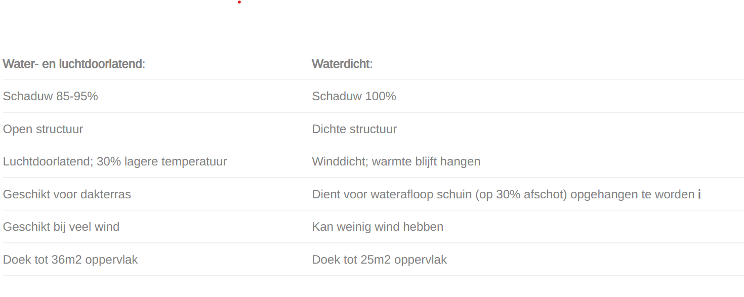 Bovenstaande heb ik geplaatst, een doek van 3 op 5 en eentje van 3 op 4. Ze zijn waterdoorlatend en hangen ook terwijl het harde wind is. Ik raad je wel aan om de stalen paal te nemen ipv eentje van hout voor de duurzaamheid.