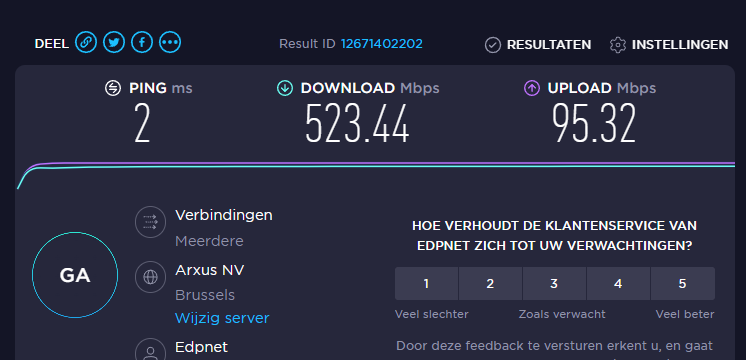 Het was me opgevallen dat snelheid was verhoogd de laatste weken. Sinds april 2020 + - 475 Mbps download. Nu plots 520 - 530 Mbps. Leuk meegenomen natuurlijk. maakt de 1 € prijsverschil bijna goed! :lol: Iemand anders ook opgevallen?