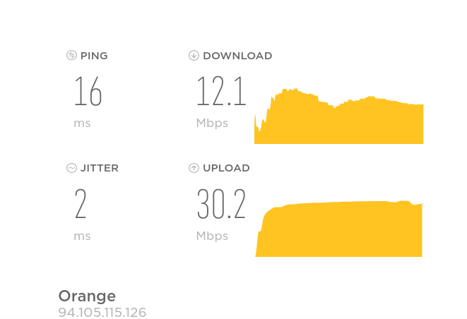 Wanneer ik een speedtest doe krijg ik onderstaande waarden. In de verhouding tussen upload en download is enkel de download en de ping duidelijk geïmpacteerd.