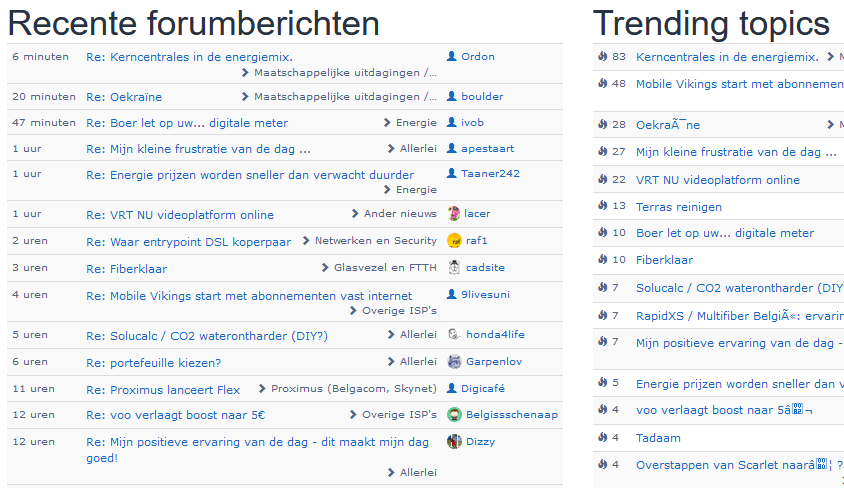 in het overzicht met recente forumberichten en trending topics wordt voor de trending topics lijst een verkeerde tekenset gebruikt, bv. Oekraïne en het euroteken € wordt verkeerd weergegeven. zie afbeelding.
