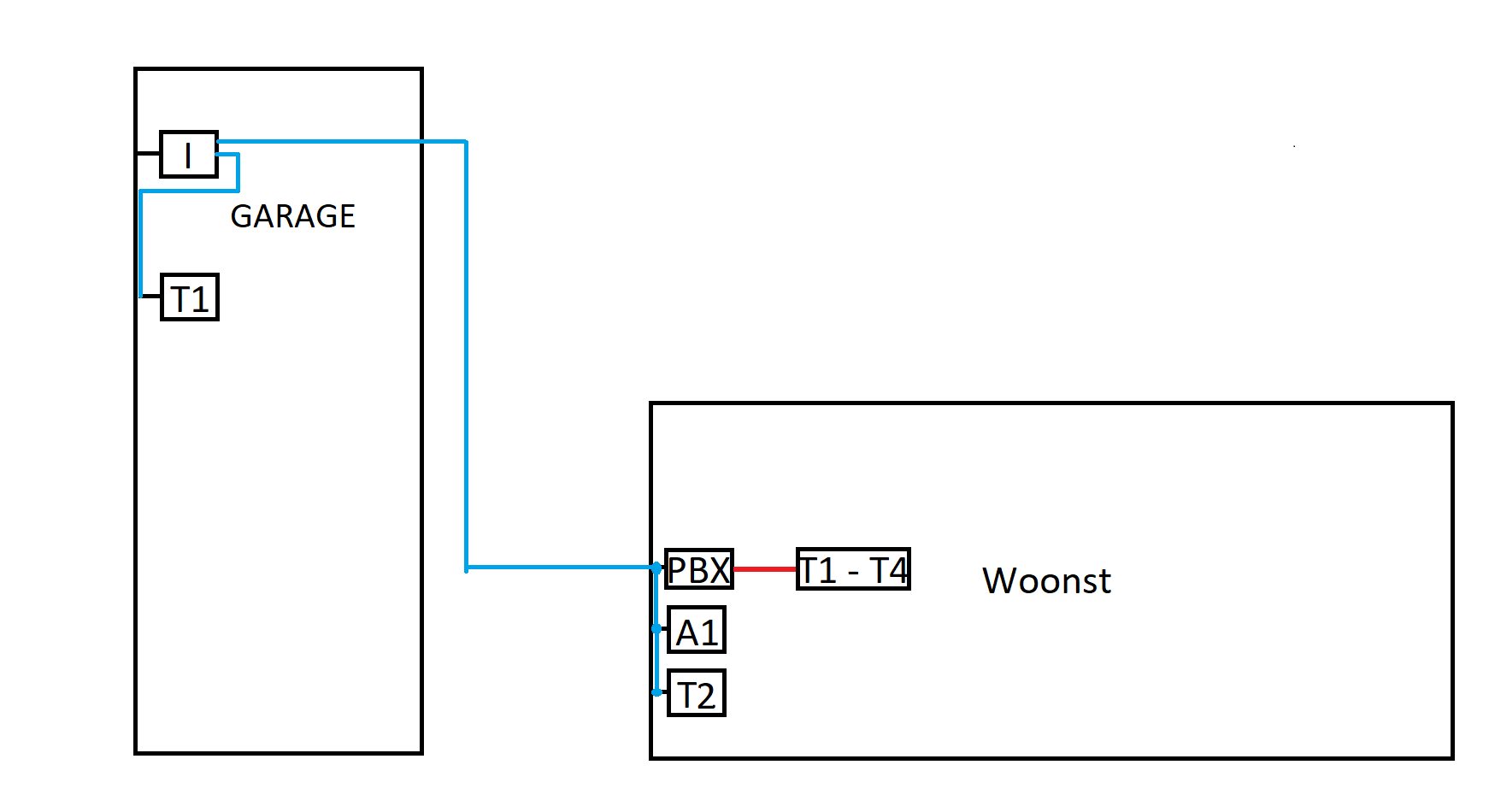 PBX: T1 - T4 (Telefooncentrale met 4 aansluitingen waarvan 3 gebruikt)