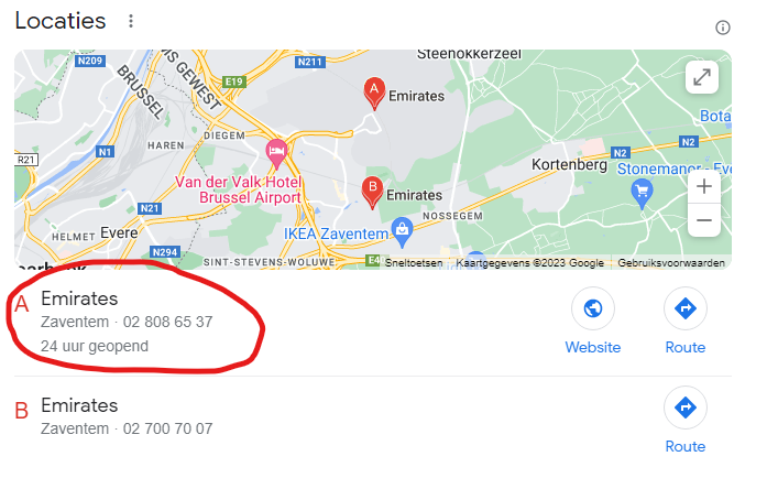 Dan eronder bij de resultaten van Google Maps komt het valse nummer te voorschijn. Eigenlijk heeft men gewoon een Maps contributie toegevoegd op de luchthaven met dat nummer, en Google kijkt dat allemaal niet na. Tegelijk heeft men de pinlocatie van de echte Emirates (die ook in Google Maps staat, met het correcte telefoonnummer, en met meer en betere reviews) wat verplaatst naar Zaventem dorp.