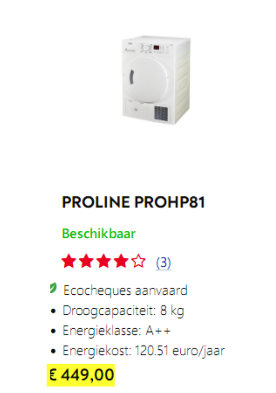 Inderdaad..., en de goedkoopste droogkast met condensing vind je al voor 449 euro en die komt dan nog eens in aanmerking voor Fluvius kortungbon a 250 euro (ener4giezuinig toestel aankoop bon ) dus voor 200 euro heb je al een condens droogkast A++pfuhu schreef: 12 jun 2023, 12:27Het verbruik blijft even (gigantisch) hoog en de vochtigheid neemt toch toe omdat er amper iets condenseert (lees: het water loopt in de winter van de vensters).cadsite schreef: 11 jun 2023, 10:02 Er bestaan condensbakken, daarmee zou je dit soort droogkasten kunnen gebruiken zonder buiten afvoer. Geen idee hoe goed dit werkt.