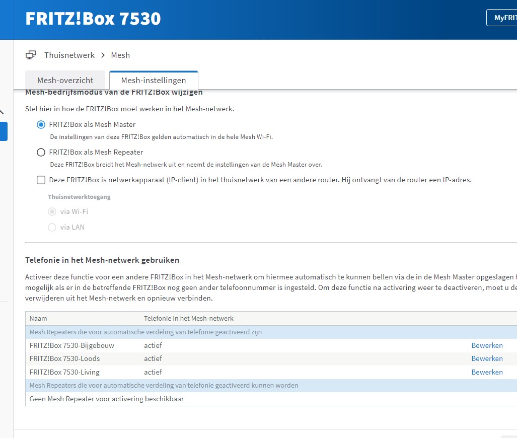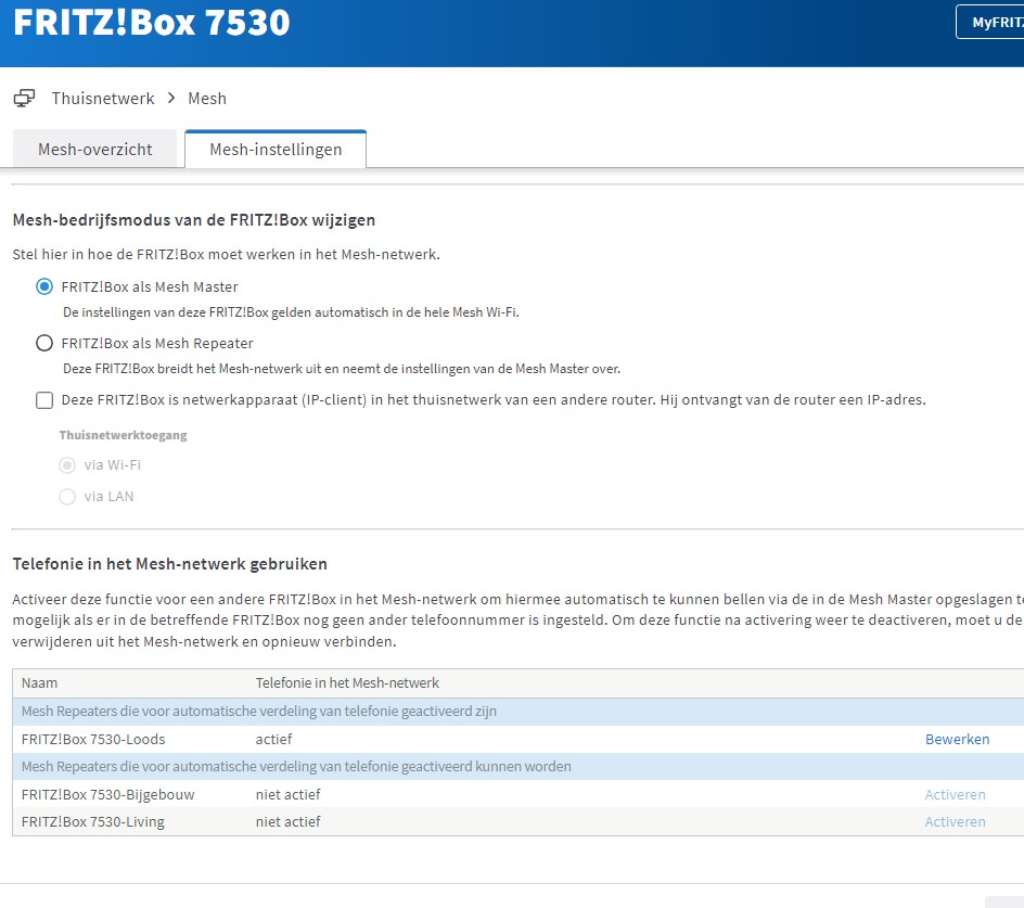 Als ik op activeren klik van bijgebouw of living gaat het scherm even weg, komt terug, maar blijft op niet actief. De loods fritz werkte wel van de eerste keer. Kan je maar 1 mesh fritz activeren misschien? Iemand ervaring mee. Of wat kan ik nog nakijken? dank!