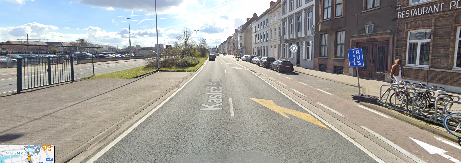 Net na het licht voor de voetgangers/zebrapad moeten de auto's van de rechterstrook invoegen naar links omdat rechts daar voorbehouden is voor de bus (de Lijn halte) zolang de werken aan de Dampoort duren ...