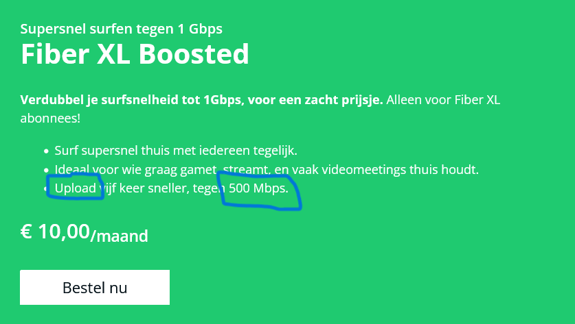 Ik wacht nog op een fiber aansluiting van fiberklaar, maar op het moment dat ik die heb ga ik direct voor die boosted Fiber XL. Momenteel VDSL XL van edpnet en ik ben echt content.