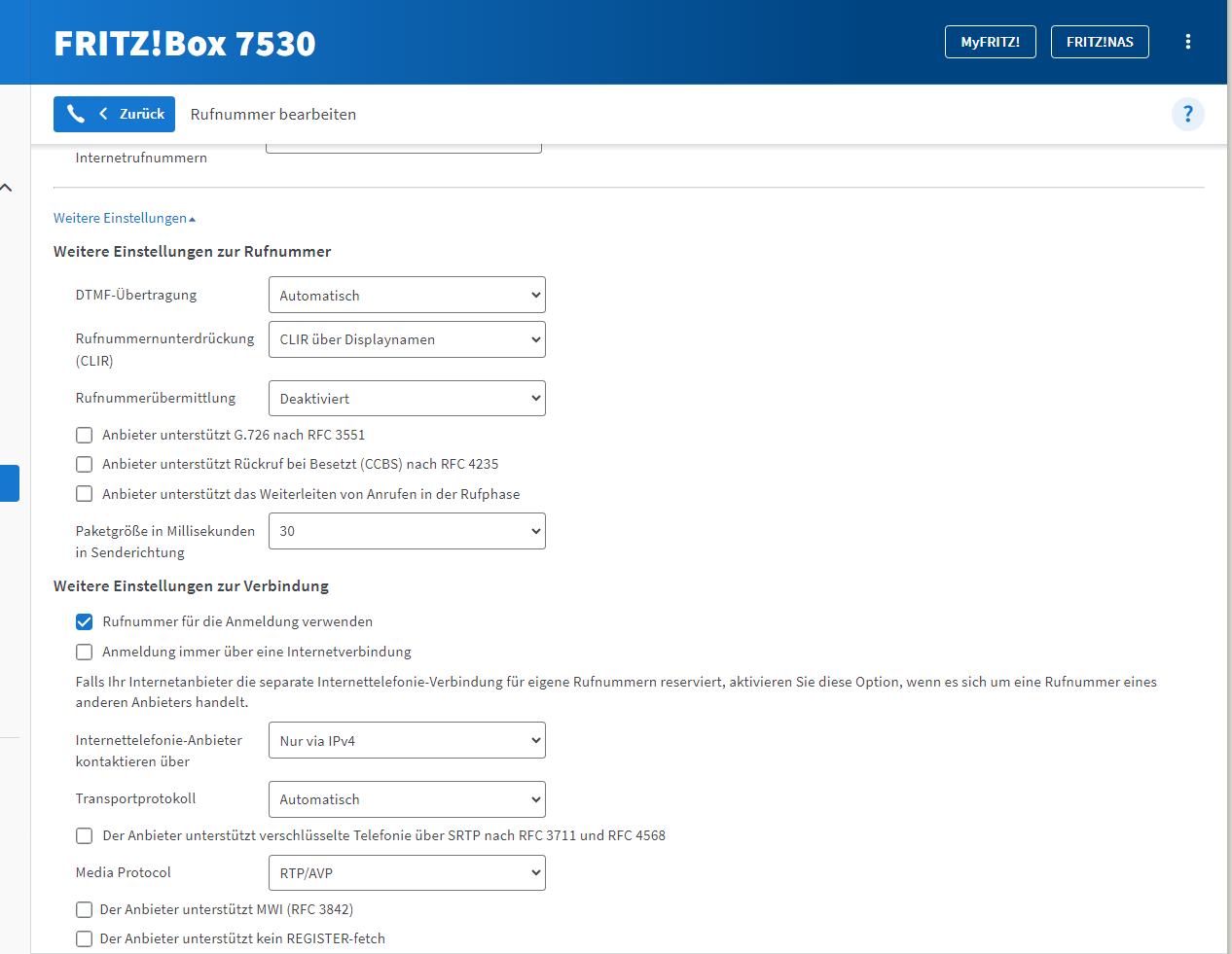 - In FritzBox > Telefonie > Eigen nummers > meer instellingen moet de optie "Telefoonnummer gebruiken voor aanmelding" aangevinkt worden.