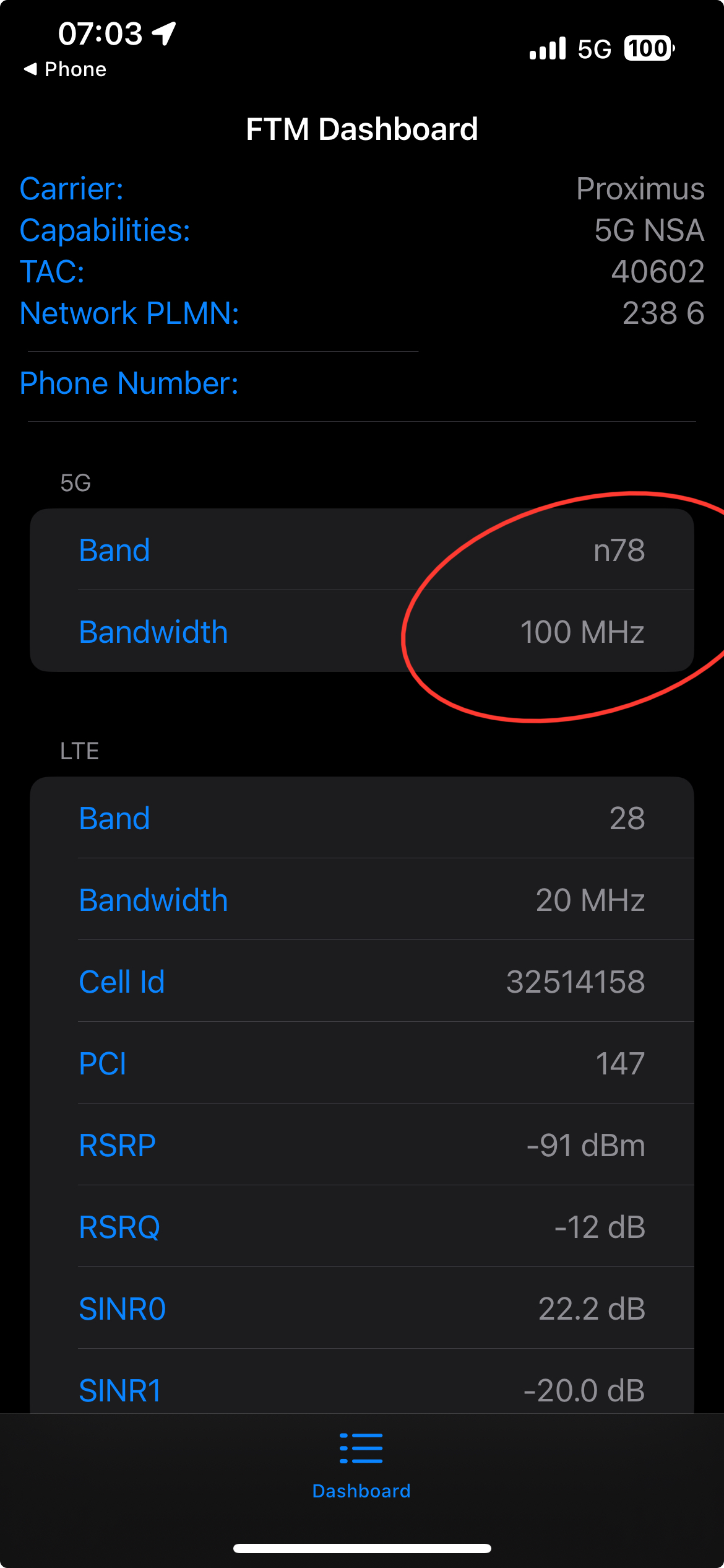 3 DK (kleinste operator) laat je op het 5G channel N78 netwerk met een bandbreedte van 100mhz (in Brussel zie ik maximaal 20mhz)