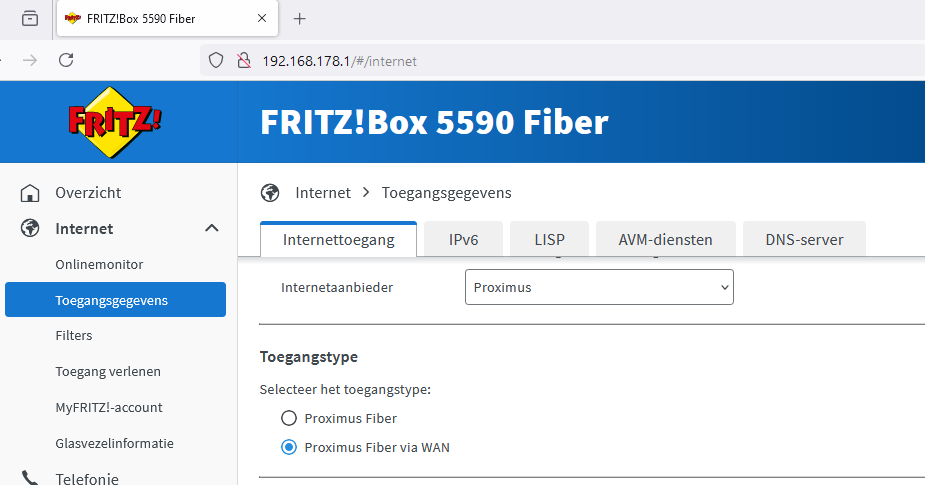 Tijdens het instellen (F!Box 7xxx) moet je de Provider kiezen, vb Proximus. Dan krijg je 2 opties: