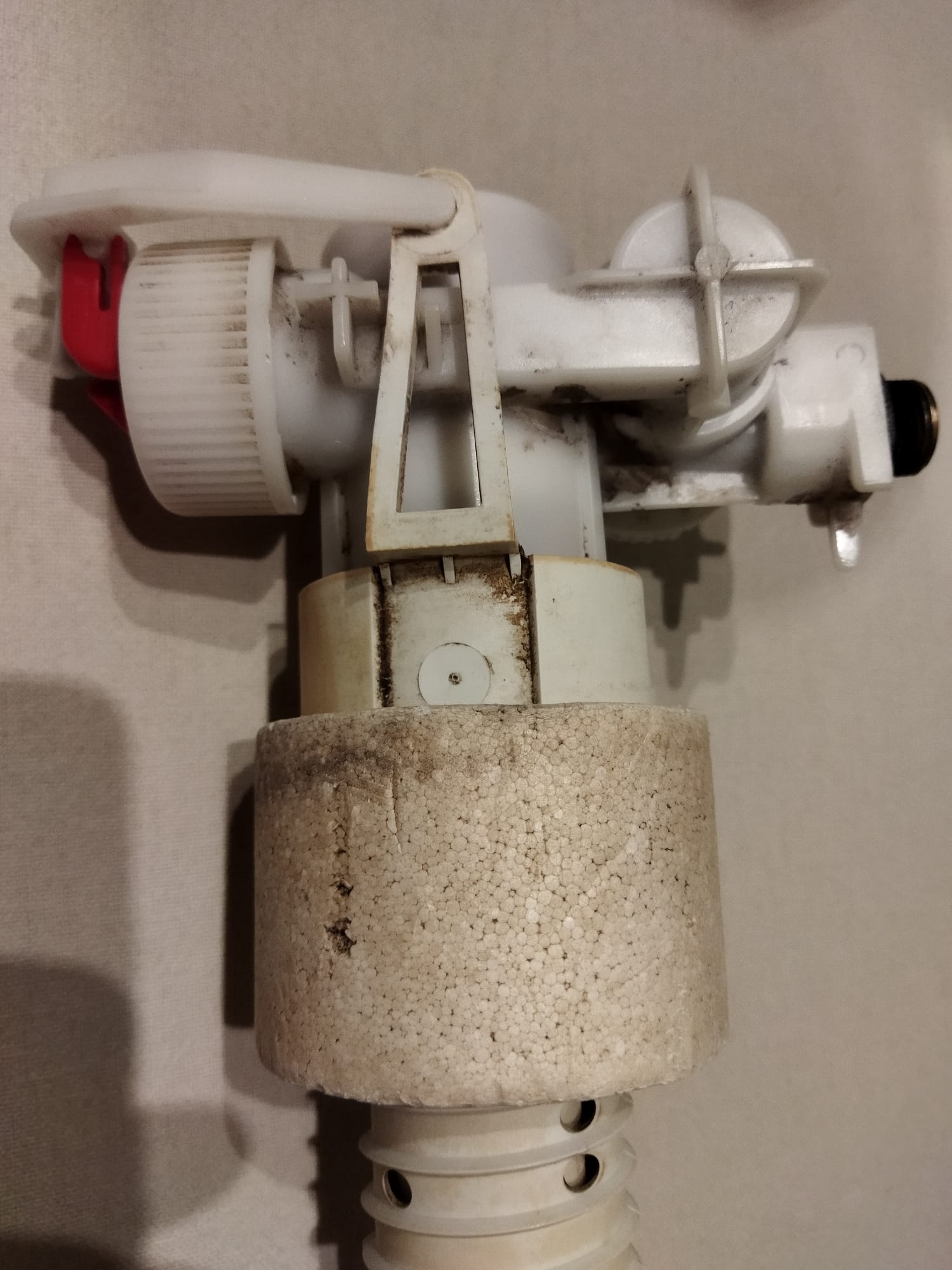 Maar onlangs begonnen beide vlotterkranen (zie onderste foto) het probleem te vertonen dat ze helemaal niet meer willen afsluiten als de vlotter bovenaan staat, met als gevolg dat het water niveau boven de overloop buis komt en het toilet dus door loopt.