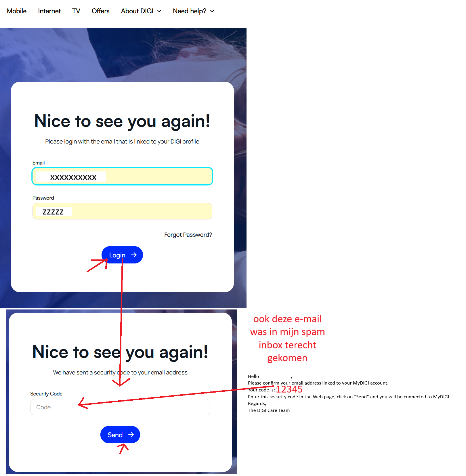 Bij mij zaten de 2 mails van DIGI in mijn SPAM folder. Gelukkig wijzen ze zelf op de spambox tijdens de registratie.