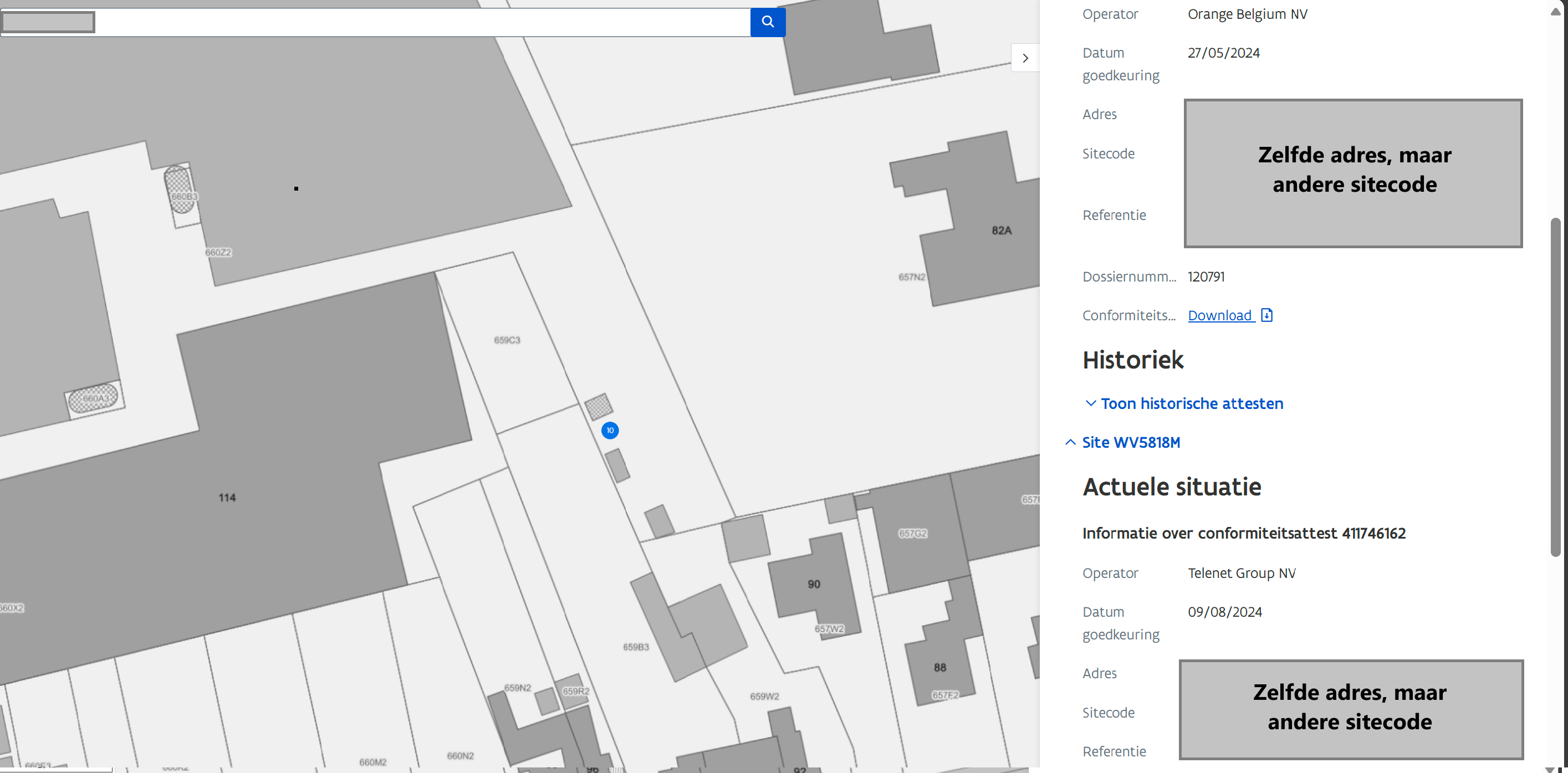 Wat het nog gekker maakt: op de Zendantennes-kaart lijken de twee masten op exact dezelfde locatie te staan. Of klopt de kaart niet helemaal op detailniveau?