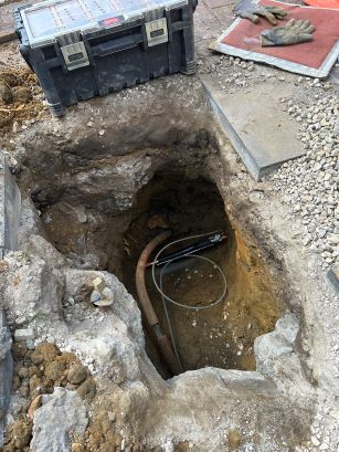 10u15: technieker arriveert en bekijkt de situatie ter plaatse. Via de energiebocht kijkt hij hoe ver hij een kabel kan doorsteken. De wachtbuis in de voortuin loopt niet tot aan de rooilijn maar tot op 2 meter daarvan. De technieker geeft aan niet te willen graven op privéterrein en stelt voor dat ik daar zelf aan begin. Voor mij onmogelijk gezien ik aan het werk was maar gezien het kleine extra stuk wil hij het uiteindelijk toch doen. Gedurende de dag een paar keer gaan checken bij de technieker: “nutsleidingen liggen niet goed, te dikke laag verharding boven op de nutsleidingen, stuk op privégrond ziet hij toch niet meer zitten (je mag mijn materiaal gebruiken als je het zelf doet), als hij het had geweten was hij er niet aan begonnen, normaal 2 aansluitingen per dag maar dat gaat met deze aansluiting niet meer lukken, ..”.